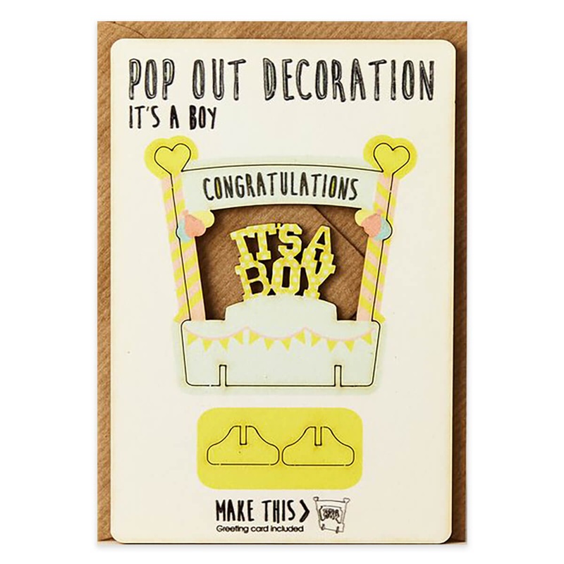 It’s A Boy pop out decoration and greetings card by The Pop Out Card Company. The card is a wonderful combination of a gift and a greetings card all rolled into one, and includes a flat-packed decorative keepsake for the recipient to pop out and assemble, as well as a cute miniature greetings card inside blank for your own personal message.